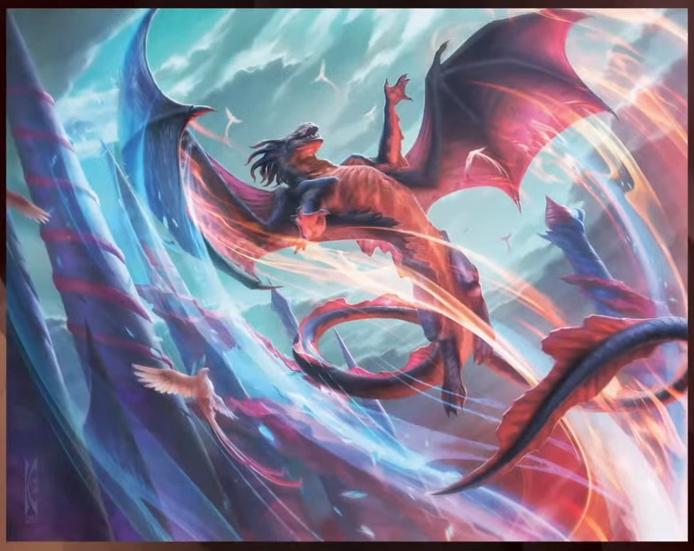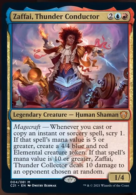 魔艺~每当你施放或复制一个法术或瞬间牌时,占卜1。如果该咒语的法术力值大于等于5,派出一个4/4红蓝双色的元素衍生生物。如果该咒语的法术力值大于等于10,~对随机一个对手造成10点伤害。
