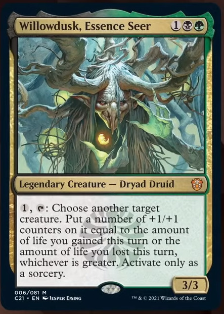 1,横置:选择另一个目标生物。在其上放置+1/+1指示物,数量等于本回合你获得或失去的生命数量,两者取最大值。只能于法术时机起动。