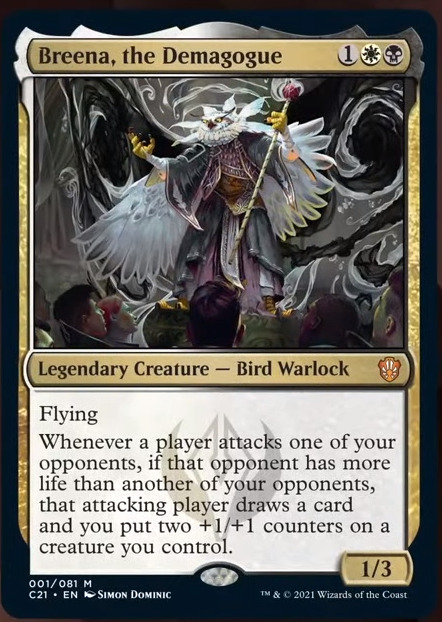 每当一位玩家攻击你的对手时,如果该对手的生命值比你另一位对手多,则该攻击的玩家抓一张牌,且你在一个由你操控的生物上放置两个+1/+1指示物。