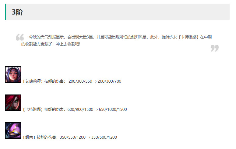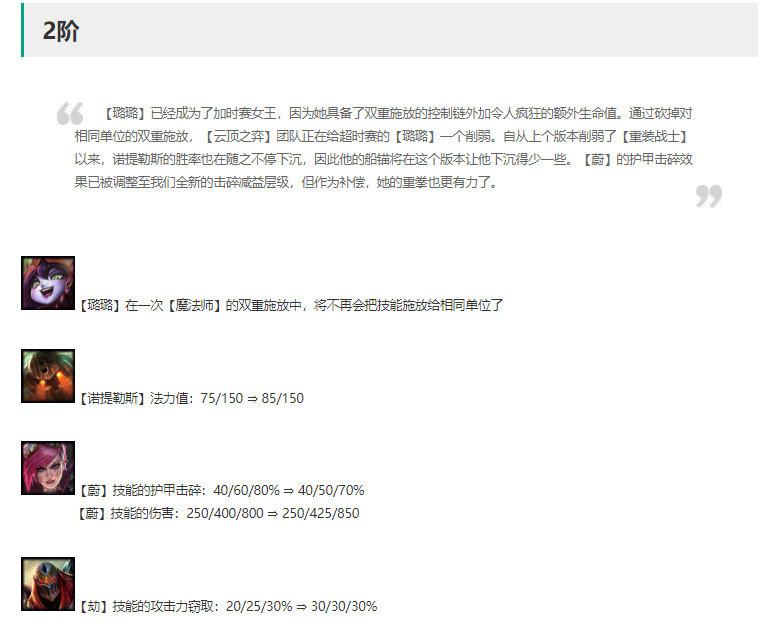 薇解读:平衡,降低2星与3星的破甲效果,增强了2星与三星的技能伤害。在正常对局中,蔚通常不携带装备,释放技能1-2次,削弱护甲效果与2星技能伤害的小加强对对局影响不算大,而三星伤害增加50点这个在对局中提升较为明显,如三星可针对给予装备如法爆或刺转,一个技能下去就能秒敌方前排大半血量,如果是后排脆皮棋子可直接秒杀。