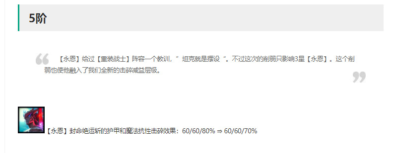 泰坦解读:增强,初始法力值提升到85,第一次释放技能速度变快。11.5版本的泰坦双抗就得到一次极大提升(但削弱了山海特效10%的伤害减免),这次第一次释放技能变快,强度提升明显。改动后重秘山海阵容强度上小幅度加强,特别是大虫子双抗获得极大提升(大虫子国服未更新),偷分上应该会更稳,但距离版本强势阵容还是有一定距离。