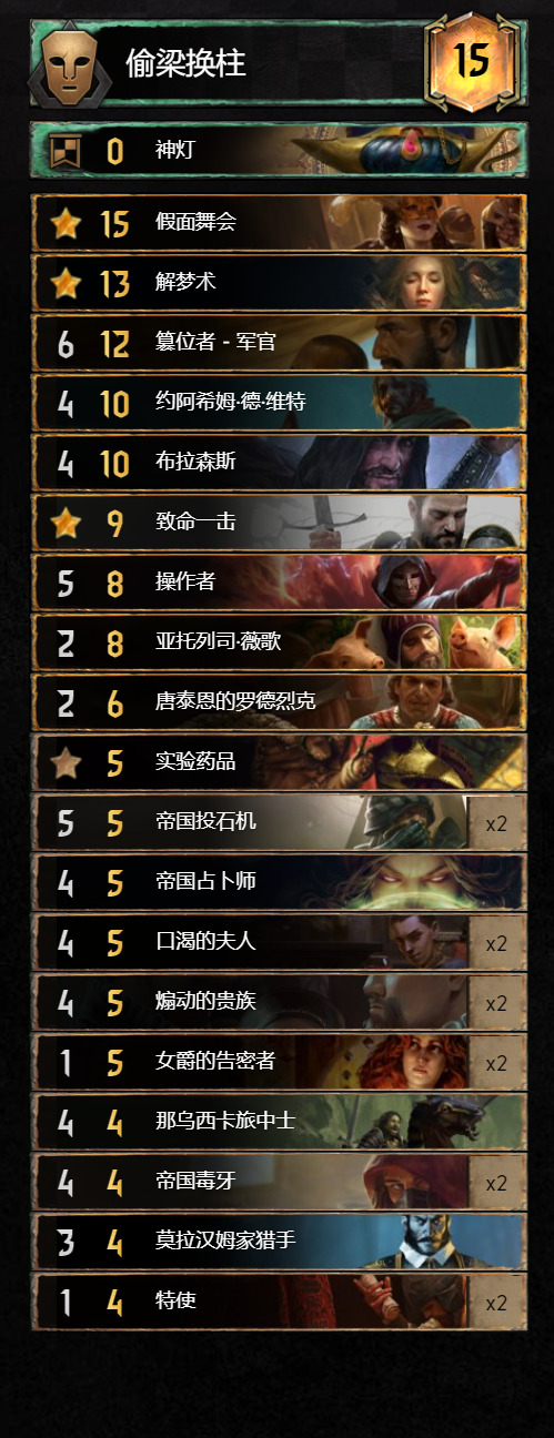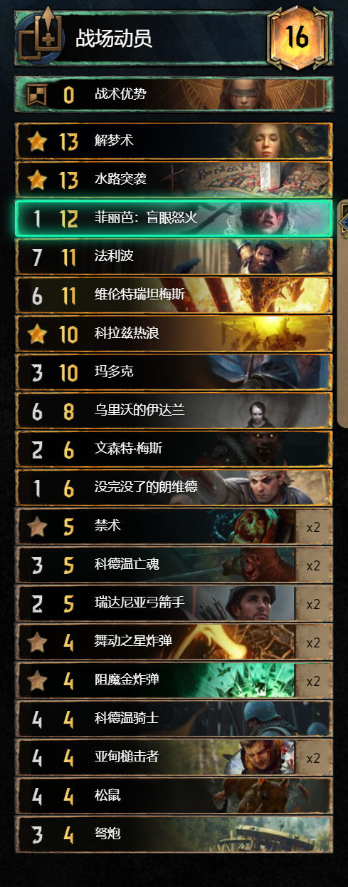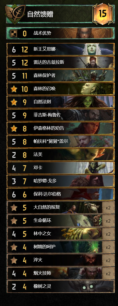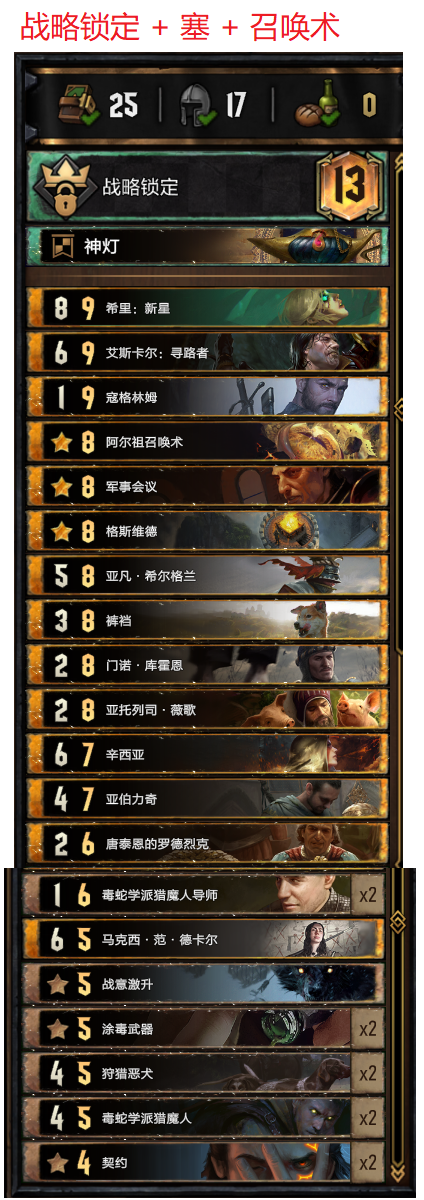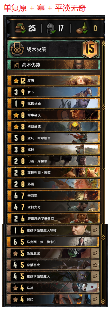 于是我删删减减,还是之前亚凡和亚伯力奇的新星套路,加上战术策略的调度方法,再加上猎魔人三基佬极限9过牌莽r2。在这里也碰上了楼下评论里的一只唯一,他r1拉了我一张寇爷,这不是最要紧的,要紧的是我发现我r3少一张牌了。于是我去掉9过牌这个思路,加上了雷索3基佬加强先手能力(6p锁我一开始就是我的备选卡,单独带也是可以的)。之后我又带了落雪(这个也是我的备选卡)配合领袖。r1基本上想要什么卡就有什么卡。这种情况下,r1基本上没人莽的过我,当然我也靠着这样的卡组莽上了普天1。