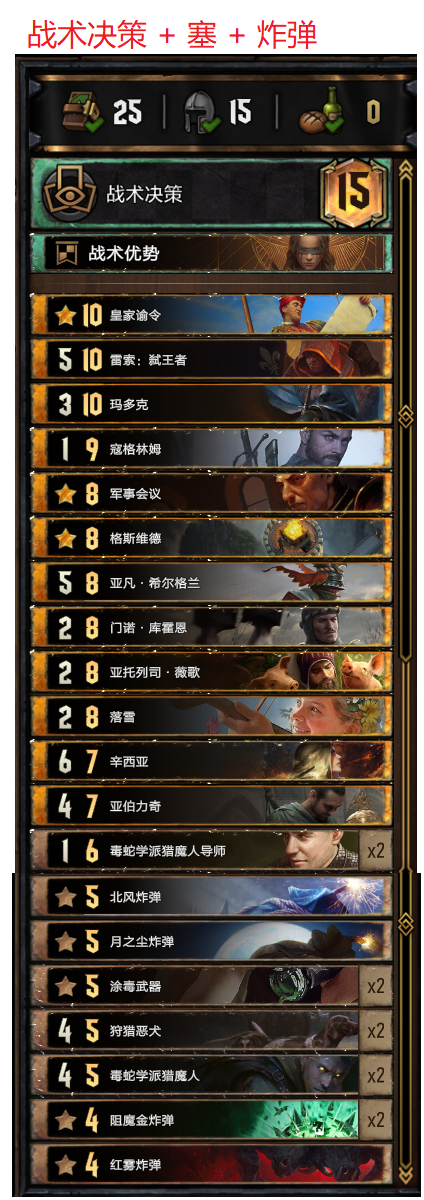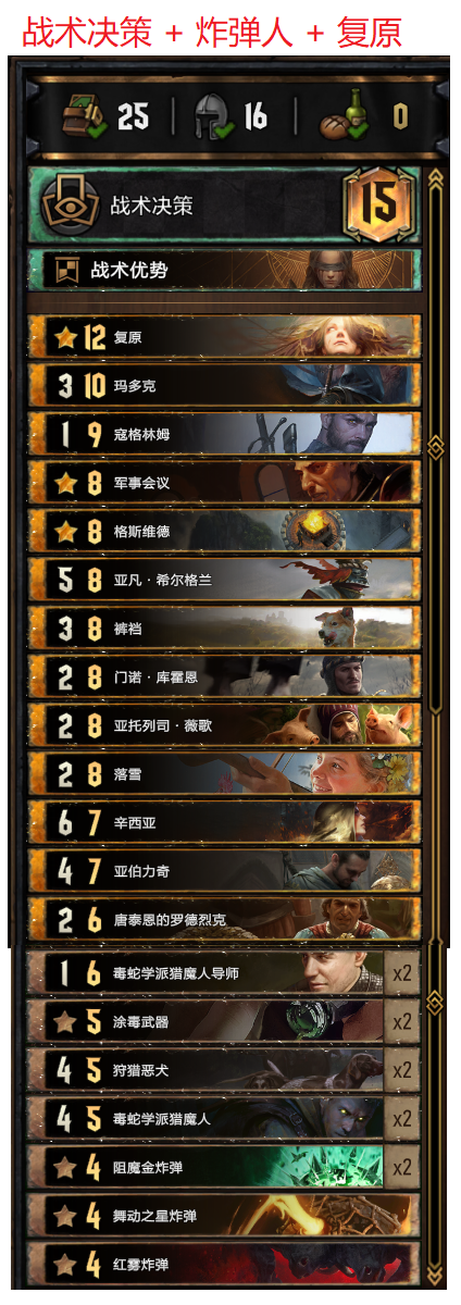 有小伙伴评论说,炸弹体系塞进去的话,增强了r1亢奋前的点数。可以更好的解决先手无牌出与调度困难的情况。我这边修改了一下调度牌,将炸弹体系挪到里面。根据我自己的理解,又塞了一张10P猎魔人雷索,复制寇爷或者复制玛多克。这卡组胜率还不错。视频已发b站。感兴趣的可以参考下。