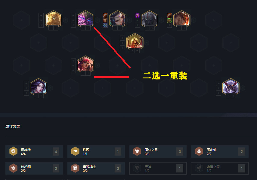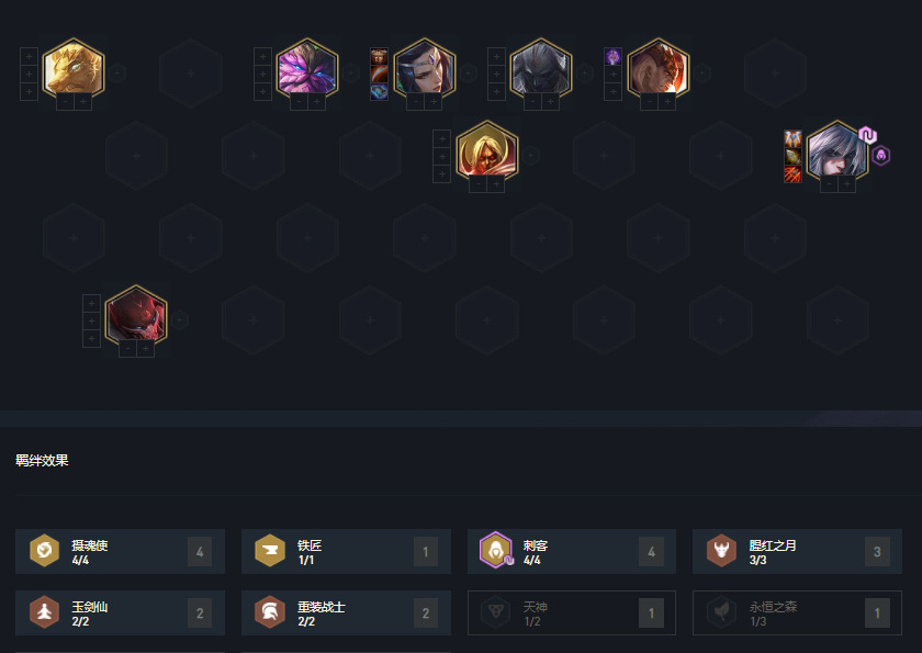 上图这套是以4摄魂为核心,在装备上肉装较多的情况下可考虑的阵容,输出点在与剑魔聚怪与输出和莫甘娜烫脚,且这版本2星剑魔的输出不低在4摄魂下,一个技能就可满血。天选上最优就是摄魂天选,这样在5费卡乌鸦,没来之前也能凑出4摄魂,提升阵容整体续航,而有天选后阵容就可加入李青、瑟提、永恩、沙皇等强势5费卡阵容强度会更高。