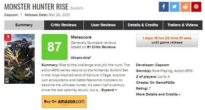 《怪物猎人:崛起》即将于3月26日正式发售,媒体评分也正式解禁。截至发稿时,M站共有61家媒体评分,均分87分,大多媒体给出了好评。