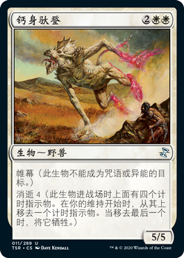 【巴拉斯驮登】是在当年t2大杀四方的单卡,无法被去除互动的特点使得基于去除的黑色系控制痛不欲生,而【钙身驮登】在当年t2的地位低了不少,但是仍然可用。在本期限制,如果你是主白的进攻套牌,【钙身驮登】的表现常常不弱于绿色的【骄暴龙】兄弟,等这个生物油尽灯枯,对手的生命往往也如同风中残烛了。