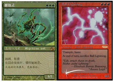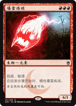 雷球也是曾经的t2小红用卡,不过如果要想在摩登登场,换个颜色可不够,得升级成【爆雷骸灵】这种质量才能登堂入室。【英雄葬火】带来的节奏和精确导师价值使得摩登的元素部族套牌一跃成为一点五线的有竞争力套牌。不过,也有一种神秘的组法是把摩登合法的12个雷球全带上,用【出土回生】和【雷身醒眠灵】拉个够……过于愚蠢,不建议尝试。