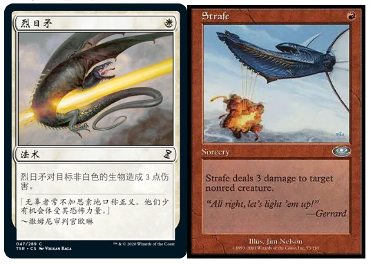 很多人可能不知道,【烈日矛】的原型并不是【闪电击】。在曾经摩登单卡弱的时候有白色套牌备牌有这个。本期限制这张算是不错的去除,但是本期打3的效应非常多,如果抓太多面对出高防生物的对手会很痛苦。