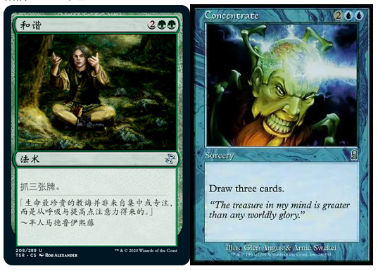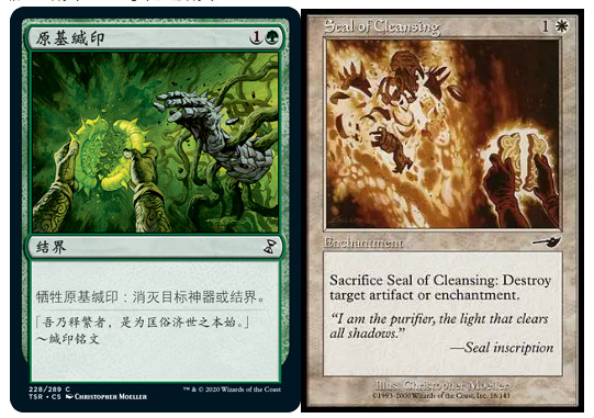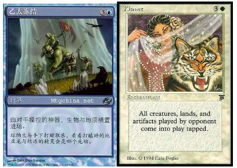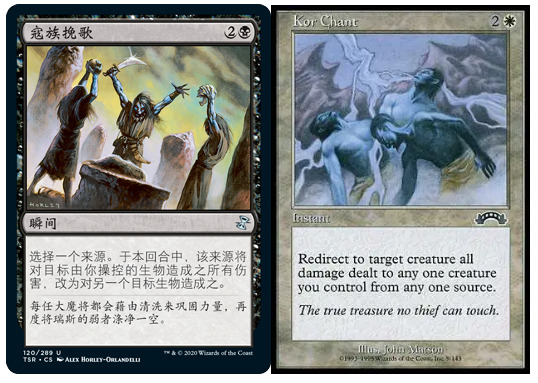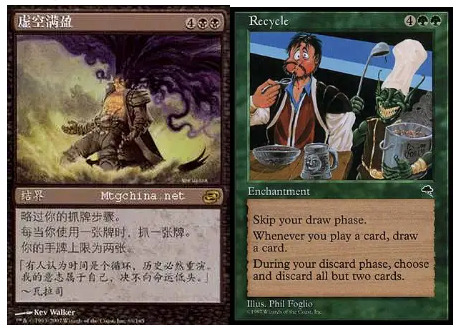 笔者认为,这是五年来我玩的最有趣的限制系列(再之前有摩登大师2015),单卡强劲,配合多多,思路广泛,对局细腻,妙趣横生。不过有些朋友在轮抓过程中也产生了很多疑问:“为什么蓝色能丢别人手牌?”“红色怎么膨胀这么多?”“为什么黑色能tap别人?”“绿色哪来的永久群体buff?”“白色的康又是什么东西?”其实呀,这些在颜色轮上很诡异,但又让人产生既视感的卡,都是重印自【时空混沌】这一系列,并且是这系列里的【混沌牌】。所谓【混沌牌】,就是把一张经典单卡,只改变颜色和颜色符号,保留其他所有卡面内容改编成的新牌。值此时间漩涡重铸发售的时机,让笔者带领大家来回顾一下所有这些【混沌牌】和他们的原型,并顺便讲点咱知道的