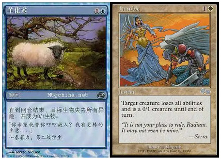 早期这种让敌人异能废掉的效应是白色的,比如臭名昭著的【谦卑】。但是后来以蓝色居多了比如【变蛙咒】,和少量绿色的比如【肯理斯化身】。【蛇化术】的存在证明这个效应现在已经是蓝绿双色的了。说起蓝绿双色,失去异能,就让人不得不想起某个3费3字母3异能的蓝(绿)人。(你可憋说了,威世智为了让玩家忘记这个蓝人,忘记这段黑历史,都不出同类别的新牌了。)只有在hou这种象征着长老龙威能的系列,才印了更高级的【谦卑】:【非凡壮景】,以及mh这种有“复古”意味的新系列,才又印了白色【斥责】。这张牌本身没有出现在本期限制,然而更厉害,颜色更奇怪的【瞬息腐坏】却重印了,【瞬息腐坏】很强,抓。