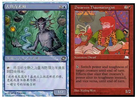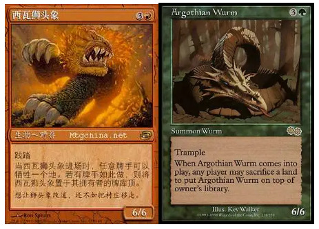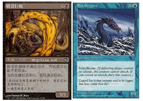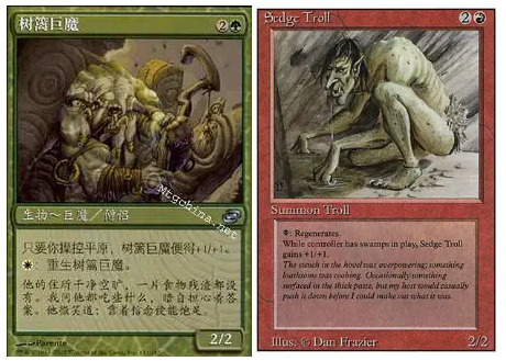 什么,早期巨魔居然是红的?Alpha有【宇轩巨魔】(这名字是不是来自于天朝牌手?)和【蓑草巨魔】哼哈二将,其中【宇轩巨魔】用红色就能重生,而【蓑草巨魔】需要借助黑色才能重生,不过真的有沼泽会更大。虽然【蓑草巨魔】变成了【混沌牌】,但是“蓑草”这个词却被【蓑草裂片妖】继承,后者也一度成为裂片妖套牌的中流砥柱。
