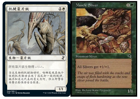 虽然裂片妖可能是本期最弱思路之一,但是这并不能掩盖【肌腱裂片妖】的强大,即使没有其他裂片妖,他自己也相当于【林群狼】,前几回合连续出很容易打穿对手。而在构筑,【肌腱裂片妖】是摩登裂片妖能成立的理由之一,8个领主的存在保证了场攻,【碎云裂片妖】的存在保证了穿透和速度,而【渣境裂片妖】能让你在自己的生物死完以后继续打对手的脸。在新系列【境域行者】的帮助下,这个部族有二线强度还是没什么问题的。