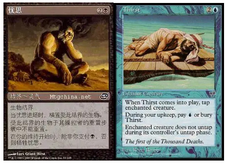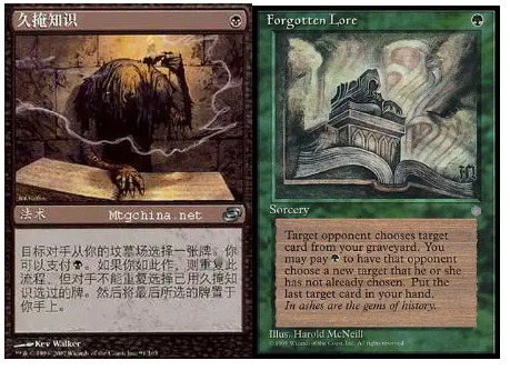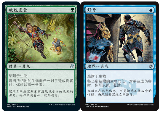曾经【敏锐直觉】是可以在摩登的【油滑波葛】套牌里有一席之地的,不过随着新皮越印越多它的位置渐渐没有了。而【好奇】除了edh和【炎灵尼米捷】或【元祖尼米捷】的配合再无存在感。真正让我们新牌手熟悉的单卡是后来出的【好奇求索】,“司马蓝”成了多少笨重套牌玩家的噩梦。另一个有趣的地方是这张卡的flavor text,揭示了时空混沌下,寇维克斯和米丽与正史截然相反的命运……