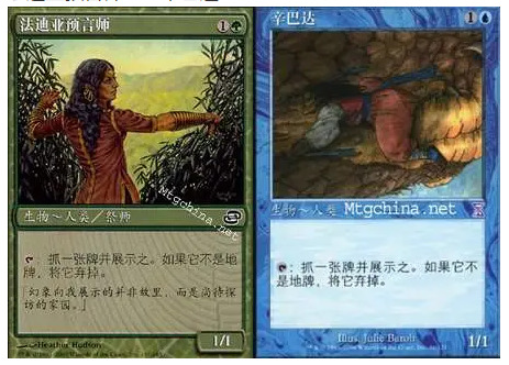 什么?蓝色怎么还能跟地打交道。让人不禁觉得改了颜色的【混沌牌】才是“正常牌”。相比于M19的【寻碧树灵】,在成功翻到地的时候这俩表现一样,在翻不到地的时候,【法迪亚预言师】接近于把这张牌磨下去(稍好一些,因为可能疯魔);而【寻碧树灵】会保留它。这样一来,【法迪亚预言师】擅长帮你解决卡地的燃眉之急;而【寻碧树灵】能确保你后期topdeck质量。综合来说,还是【寻碧树灵】更胜一筹。