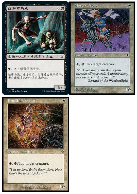 黑色的tapper,你不爱吗?甚至有反抗军类别让【安罗斥候】或者【枯萎祷士】找出来,强,抓。【诱敌专家】更老但是【宾纳里亚布陷兵】和这个牌名字更像,笔者说不清原型到底是哪个。