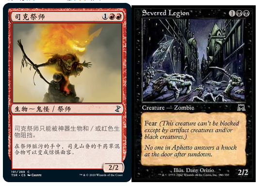 早期【恐惧】是关键字异能,而本期做的这个混沌牌【司克祭师】和差不多的白牌【安罗追寻者】没有关键字而是直接写规则了。虽然威世智后来抛弃了黑色独享的【恐惧】,转而做了所有颜色都通用的【威吓】,类似【司克祭师】的牌也没有被勘误成【威吓】(这导致如果你改变【司克祭师】的颜色,依然是能被红的挡不能被绿的挡)。类似地,【迈勒提斯的达克索斯】也没有被勘误成【潜匿】。这张牌不太厉害,没有配合也没有单卡强度,不要主动浪费抓位,但是凑数还勉勉强强。