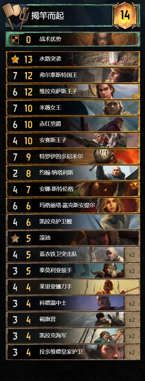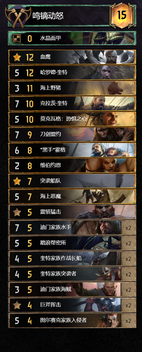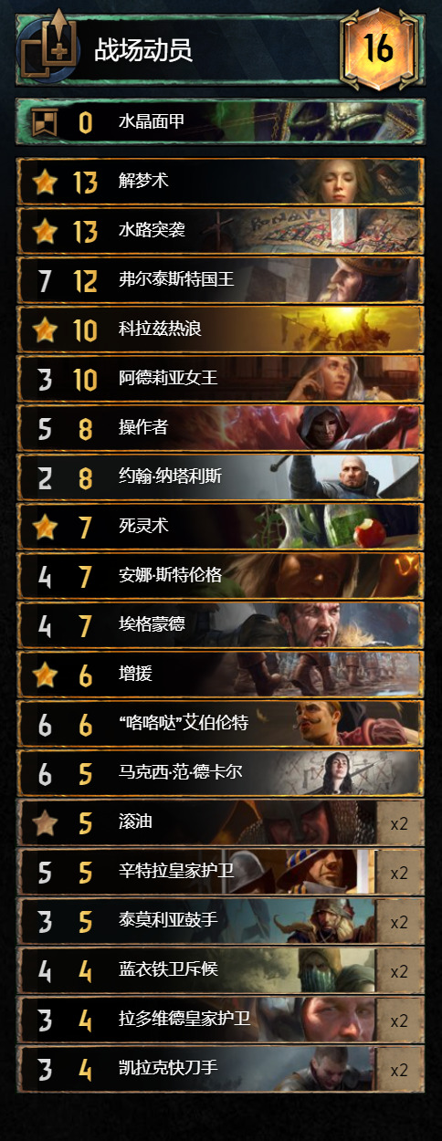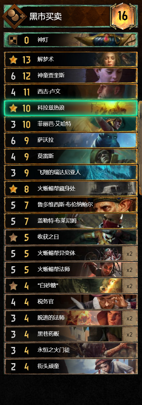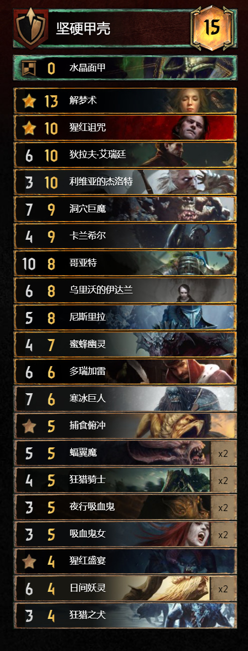 其次说吸血鬼体系本身的弊端——长局暂且能打,短局异常拉跨,那么对于三局两胜的昆特牌之“宗”,难道注定我们必须拿下R1,放R2,拼R3吗?很显然这样就很被动,所以吸血体系必定需要短局爆发的支持,这样才能长短皆可一战,因此,“大大”怪兽单卡的加持也是制胜的关键,巨蜈蚣和欧兹瑞尔必须安排上,最后就是吸血鬼的单卡选择了;