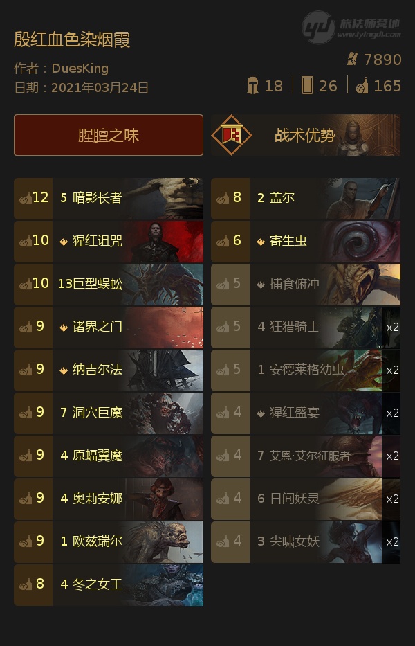 这些卡统统配好,加上保护引擎的97卫士,剩下的资源就是可替换可自行选择的了,本人选择猩红盛宴,侧重净化属性(打3叠3重伤锦上添花);不解释的捕食俯冲(后手利器);寄生虫(可替换);94翼魔(可替换,这张单卡优点在于配合领袖到同一单位可以涨到单卡16点,面对大劣势气宗,或许能有一丝爆点机会);10P血月(看个人喜好,可替换,我带是契合奥丽安娜和