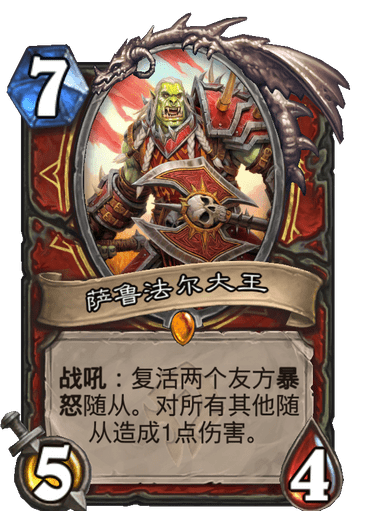 对于战士来说,可以与之形成优秀配合的暴怒牌不算太多,为了增加萨鲁法尔大王的收益,低费暴怒牌比如战歌大使自然还是不携带为好。就职业牌而言,石槌掌锚手质量出众,是个优秀的选择;而复活旋风争斗者则可以多打全场1点伤害,这倒是可以把萨鲁法尔大王变成一个更大的AOE,不过战士并不缺乏AOE就是了。中立卡中比较合适的随从有满意的奴隶主与陶拉祖武士,不过这二者脱离萨鲁法尔大王的表现可能不会太好。