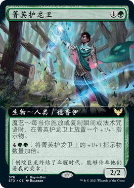 除了宽图牌将只能从聚珍补充包里开出之外,斯翠海文有一张赠卡是传统闪卡异画的宽图版本菁英护龙卫。这个版本只能透过买盒赠卡取得(送完为止),你将无法在聚珍补充包里开到这个版本的菁英护龙卫。
