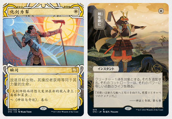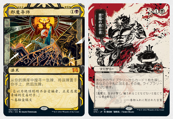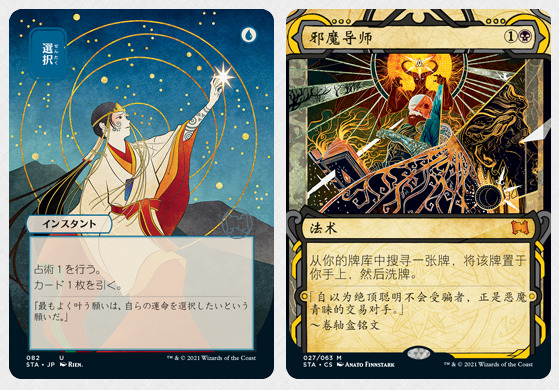 两种牌框都强调了让这些秘典牌能手绘原稿的感觉,并用无与伦比的方式带到万智牌的牌张上。