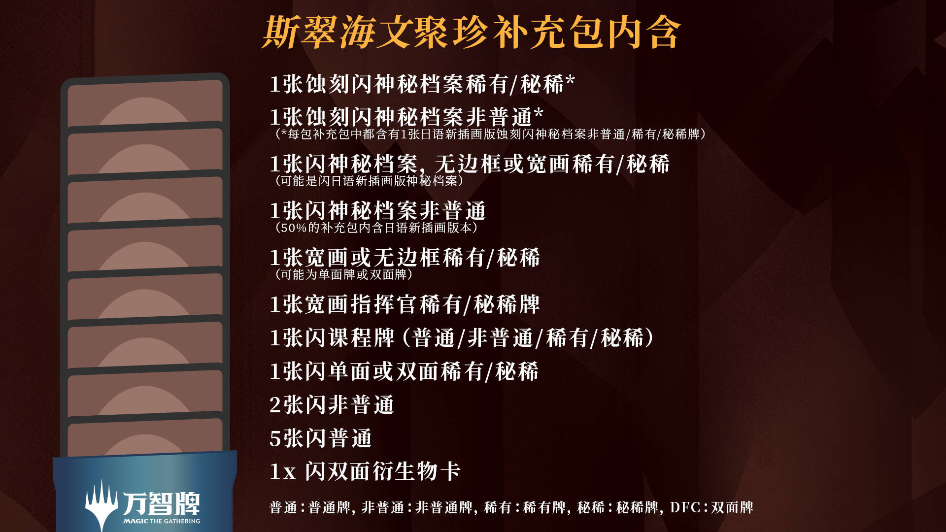 每包轮抽补充包中都会有一个固定的位置能开到非普通(67%)、稀有(26.4%)或秘稀(6.6%)的秘典牌。除了那个固定的位置以外,你也有机会可以获得额外一张传统闪卡的秘典牌—而在这个时候,那将会取代原本补充包里一张斯翠海文的普通牌。