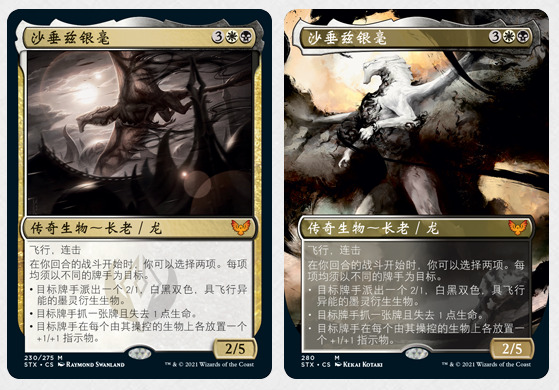 整体来说,除了五张龙长老和鹏洛客外,斯翠海文的主系列里每张稀有和秘稀都会宽图的版本,你甚至可以在系列中开到宽图版本的模式双面牌。宽图牌将只能从聚珍补充包中开到。