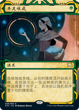 丰足收成(Abundant Harvest)这张牌是来自摩登新篇2的新牌,现在以秘典的形式出现。在摩登新篇2发售之前,这张牌摩登不可用。但在薪传特选指挥官赛制可用。也会加入MTGA。