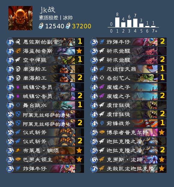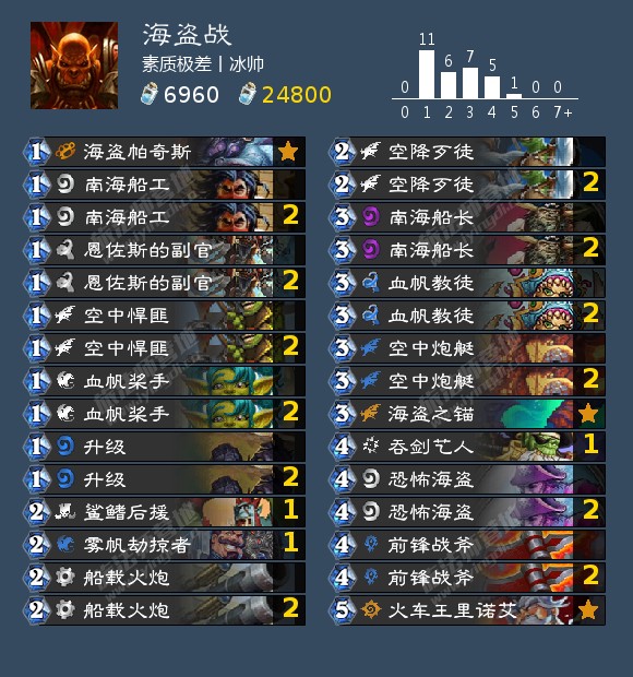5分。到了本期的重头戏,也是有争议的一张卡,大多数人说它是神卡,也有人说它不适合进攻型战士。理性分析冰帅认为它是强卡,但不是神卡。评价一把武器,一般攻击力等于费用,带正面特效的都是好卡。从模型上看,这卡肯定是爆炸的,四费可以打至少九点伤害,而且还有过牌的属性,况且战士还可以给武器升级,血帆桨手还能给武器减费。海盗战的刀又不是只打脸,这卡可以控场过牌,等刀养大了再砍脸。冰帅认为这种模型的武器,任何战士都可以携带奇数战除外。对比吞剑艺人,当回合的节奏弱一些,但是续航更强。对比昔日海盗之锚,这卡打慢速不能无限制的过牌升级打脸,因此强度不如完全体的海盗之锚。