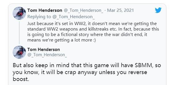 另外一个舅舅党Tom Henderson在Twitter上也表示《使命召唤18》设定在架空的历史中。他说设定自二战,并不意味着玩家就会获得标准的二战武器和连杀,实际上这将是一个虚构的故事,在那里战争没有结束,意味着我们会获得很多东西。但记住这款游戏将有SBMM(基于水平匹配,skill-based matchmaking)功能。