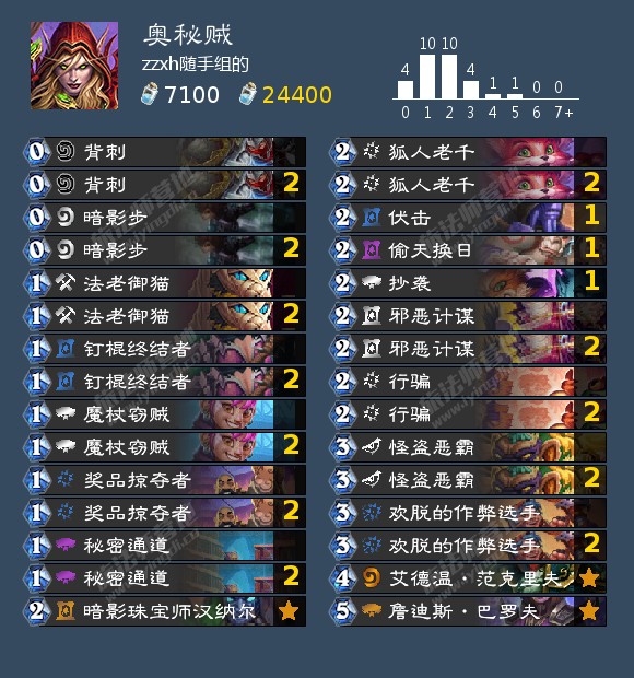你可能会问,珠宝师汉纳尔和钉棍终结者也没有回调呀,为什么要玩奥秘贼?因为大范回调了呀!奥秘贼的大范实在是太重要了,基本上整体思路就是用奥秘过牌+干扰对手(现在有欢脱的作弊选手+邪恶计谋+通道的过牌,奥秘贼基本上可以用30张牌和对手15张牌打),在中期找到机会就做一个大范压住场面,然后配合奥秘以及冰棍灵活解场,是一套上限很高的卡组。