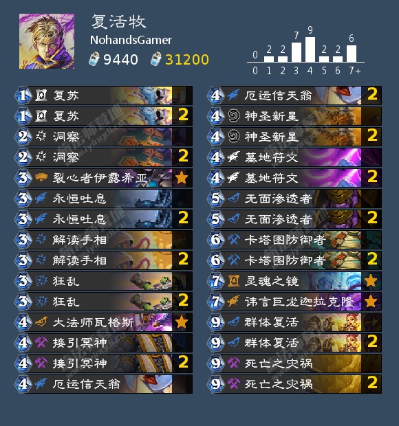 最后给想月末冲一个传说的玩家推荐一套卡组,复活牧现在是针对环境最好的套牌。NohadnsGamer用这套牧师以8-1的战绩打到传说第12。现在的环境基本上都是激怒战(因为邪翼蝠的回调还有比较快的打脸卡组),复活牧在卡组特性上非常克制激怒战,无面渗透者+卡塔图这两张嘲讽生物战士很难处理,后期配合群体复活可以在回血的同时架起嘲讽,让鱼人狼人之流望墙兴叹。因为厄运信天翁的回调,三费曲线上满编,四费接接引冥神可以极大污染抽牌质量,增加对手鬼抽可能。因为复活牧操作比较简单,加上现在克制主流环境,推荐给大家。