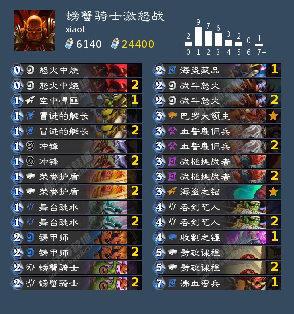 打了一天的天梯,我遇到的80%对局都是这种战士。因为冲锋的回调,战士将之前的库卡隆冲锋复制换成了螃蟹骑士+冲锋+怒火中烧+荣誉护盾 +血誓雇佣兵的超高斩杀组合。螃蟹骑士最厉害的地方是他可以被舞台跳水检索,而且中前期解场站场效率都很高。我印象很深,有一局对手二费出了个螃蟹骑士我没有解掉,他直接怒火中烧+两个荣誉护盾,把我踢傻了。其他玩法和之前的激怒战都一样,更换了后期斩杀组件激怒战的整体强度又变高了。