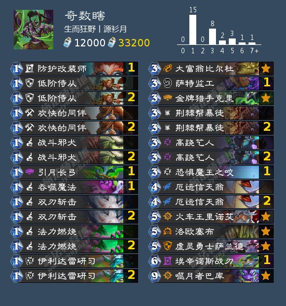 来自 生而狂野丨源衫月的一套奇数瞎,他在传说前一千打出了53局68%的胜率。不同于现在流行的极限抢血思路,这套构筑上偏向于传统的中速节奏体系,优势在于带的更厚,打控制卡组优势更大。奇数瞎自从蛋刀被削弱之后一直中期乏力,终于在最新的补丁中蛋刀回来了,虽然失去了一点耐久,但有了蛋刀之后战斗邪犬和荆棘帮暴徒对对手的威胁就会提升一个档次,同时有金牌猎手的存在可以无伤解场,这是之前版本没有的。此外信天翁的回调也是补强巨大的,打宇宙卡组不再乏力。卡组还带了大富翁来搏个上限,增加我们的爆发伤害。值得一提的是卡组带了冷门单卡虚灵勇士, 其实激励体系更像是为奇数瞎设计的,这卡可以增加卡组的厚度,有时候也能搏一个梦想~