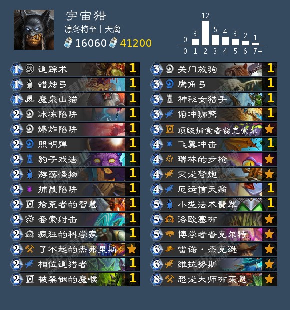 来自 凛冬将至丨天离 的一套宇宙猎,他以40把55%胜率打到了国服1500名。在照明弹和恐龙大师等单卡回调后,宇宙猎又回到了大家的视线,狂野猎人也终于有了出路。在诸多卡牌回调后,以任务贼为首,偶数骑为辅的回归卡组加入了狂野天梯,环境提速。这套宇宙猎带这么薄的原因就在于此,记住节奏至上,打任务贼要牢牢把握住场面并全力抢血,捕鼠能很好地限制任务贼的节奏,塞布完成绝杀。对阵偶数骑场面第一,要解掉每一个怪,由于有尼鲁巴的存在可能会小劣,所以可以留一个俯冲狮鹫或者飞翼冲击。