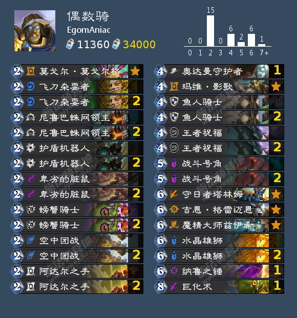 来自EgomAniac的一套偶数骑,他在传说分段打出了65场64%的胜率。 卡组模版来自营地老哥 我就吼吼赖,不同于上期的偶数骑,这套带的更厚,并外挂了报告兵体系。 偶数技能和空中团战主要起润滑曲线和减费水晶雄狮的作用,除此之外空中团战打快攻还是很舒服的。这套打传统快攻和任务贼均为优势,打宇宙卡组五五开,打大哥牧劣势。 脏鼠有奇效,号角拉出来是2—6嘲讽,打otk还能拉key牌。螃蟹骑士单卡质量过硬,帖了buff还能打出海量输出。