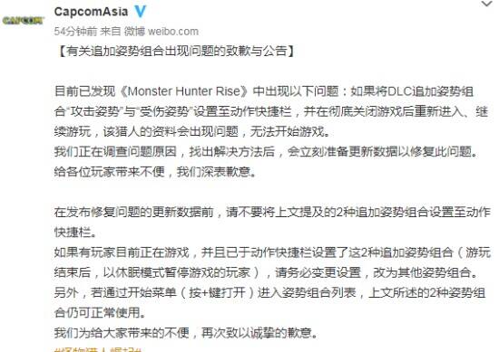 卡普空官方微博今天发布消息,就《怪物猎人:崛起》中出现的追加姿势组合的相关bug进行了说明和道歉。根据官方介绍,如果在《崛起》中将DLC追加姿势组合设置到快捷栏,在关闭游戏重进、继续游玩时,该猎人的资料就会出现问题,无法打开游戏。