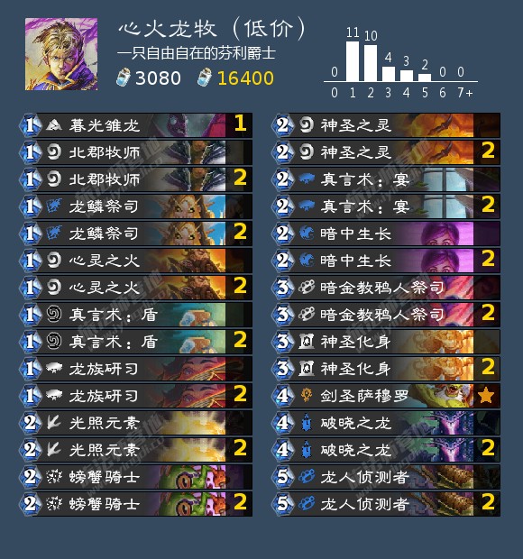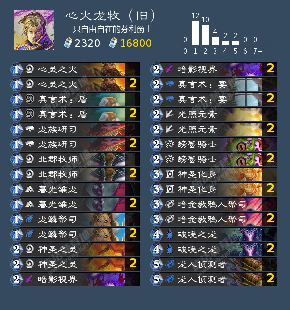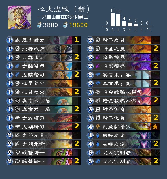 心火龙牧由来已久,不提从开服就存在的心火牧的话,这套卡组的基本框架在女巫森林出破晓之龙的时候就已经成型了,这套卡组在那个偶数萨奇数骑的年代堪堪t3,因为被衰变克制的实在太死了。今天在外服特辑里面看到才又掏出来玩,意外地发现强度很不错。28号上传说时战绩如下: