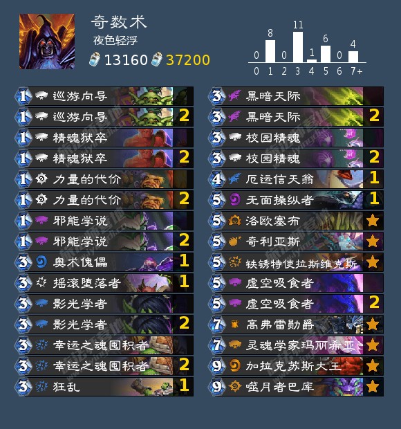 来自 夜色轻浮 的一套奇数术,他在传说分段打出了44局66%的胜率。(以下介绍来自原作者)这套构筑上很有意思,奇数术的优势在于抽牌不扣血,加入残片体系后卡组前期节奏舒适,手牌充盈,血量健康丝滑流畅,对战快攻更容易兼顾血量与场面,大王重做成英雄卡后带来了过硬的后期场面。这套卡组兼顾快攻抗性,后期能力及斩杀,娱乐而且有一定强度。残片体系为卡组提供了少量而不稳定的奶与前期的节奏,而升级后的技能强力且十分契合残片体系,能够增加对战快攻时抽到残片回血的概率也可以无代价过牌寻找key牌。