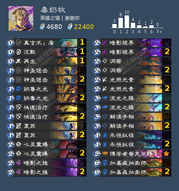 来自 英雄之墙丨谢谢你 的一套毒奶牧,他在钻五分段打出了21—9的战绩。这个从安戈洛开始出现的娱乐卡组,经过几个版本的拼拼图终于有了一定的强度,新版本盾的回调也算是一个小补强。核心思路还是通过光照元素和解读手相减费,配合加基森大量刷牌,然后通过毒奶斩杀。博学者可以定向检索加基森,洞察也是为了定向检索随从,不一定非得腐蚀。