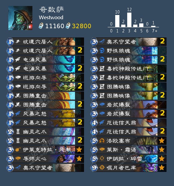 来自Westwood的一套奇数萨,他以12-3的战绩打上了传说。奇数萨在这短暂的几天可以使用“幽灵之爪+法强图腾”组合(需要装备非萨尔皮肤),再不爽就没机会了。这套带上已经回调的信天翁和加强版的狼魂,加上新版本众多的奇数好卡,本来崛起在望,奈何法强图腾已经不在了,可以说这版本是奇数萨最后的荣光了。