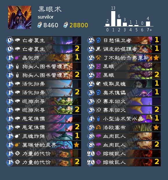 来自 survilor 的一套黑眼术,他以60局76%的胜率完成了国服登顶。无论版本如何更迭,黑眼始终屹立不倒。补丁后黑眼术又收获了奥术傀儡和吸取灵魂两张好卡。吸取灵魂提供低费解场和回复,也能给血肉巨人减费。奥术傀儡作为力代的载体,比火车王更加低费灵活。不同于之前的玛克扎尔小鬼弃牌体系,这套带了大量的回血以及杰弗里斯。奥数傀儡双力代配合姐夫给的风怒,可以做到空场9费24斩。(如果巨人站场姐夫还亮的话斩杀能更早更高)