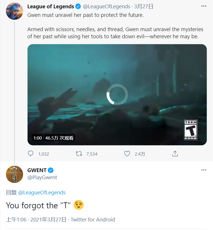 《梦幻联动》:“Gwen加入英雄联盟。” “你忘了T。”