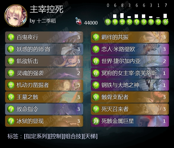 主宰控死是控制兼组合技思路,擅长通过解场、回复组件遏制抢血思路的攻势。而在面对其他对手时,则要凭借冥府的女主宰·奈芙蒂斯的特殊胜利取胜。