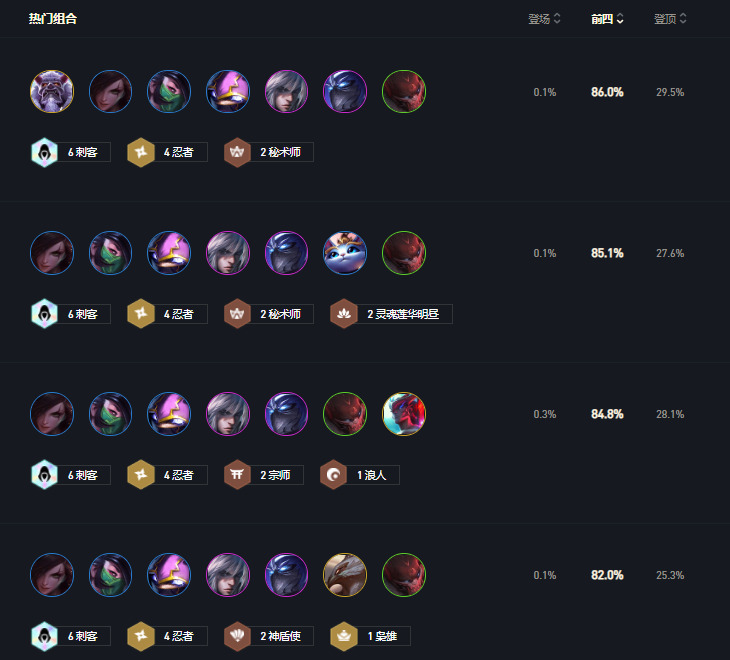 上图数据来自官方,大家可以看到忍刺成型后前四率普遍能达到80%以上,而吃鸡率最低也在25.3%,吃分与吃鸡还是比较容易的,最重要的就是登场率极低也就是说同行非常少(上图官方阵容可能出现问题所有阵容均忘记标注劫了,这算不算帮官方找BUG)。