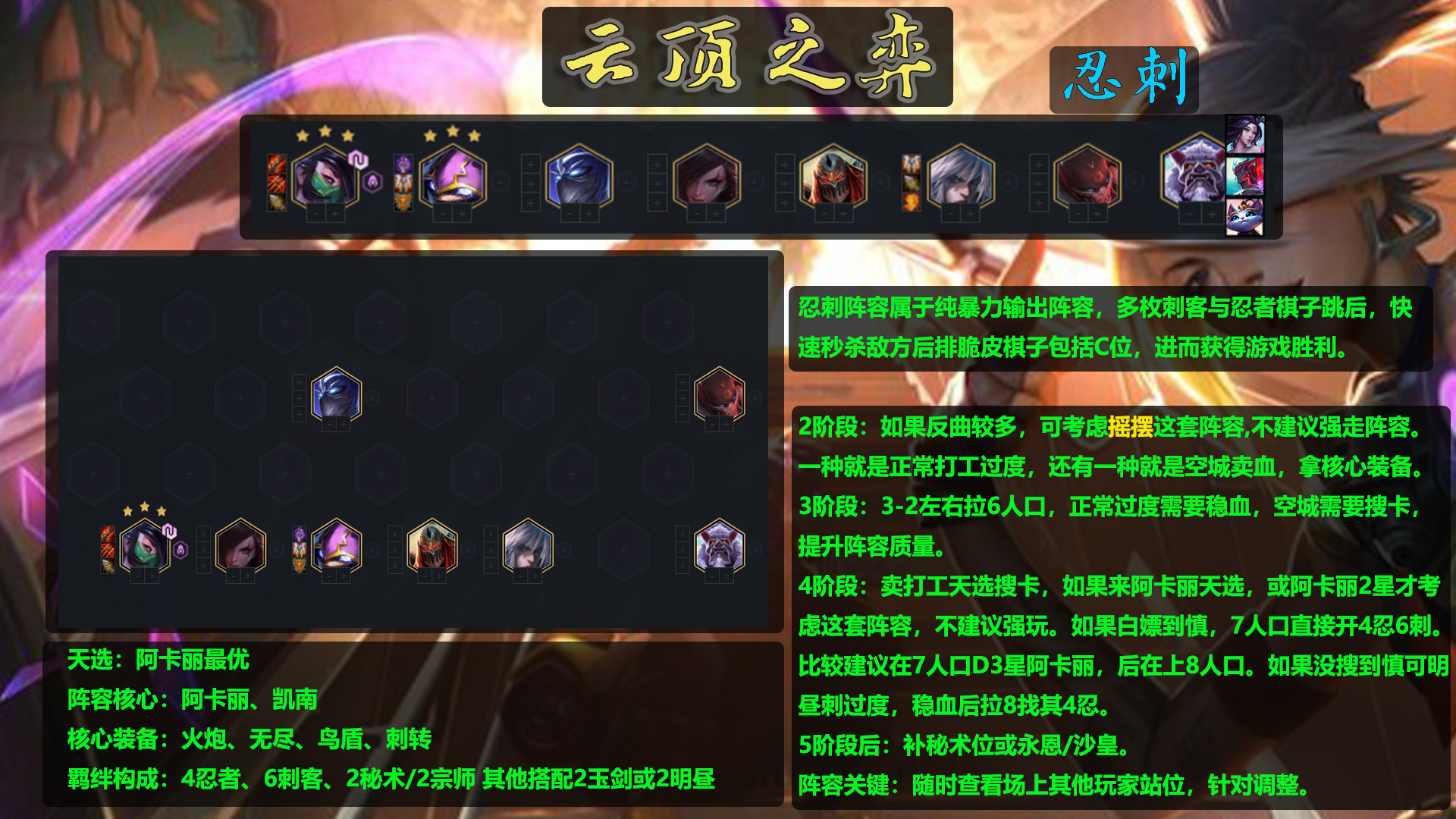 4阶段:3阶段野怪卖掉打工天选,4阶段搜卡如果来阿卡丽天选就可以玩,如果阿卡丽来的多其他刺客天选可考虑,如果凯南天选最好有刺转否则只能走4刺强度上没有6刺上限高。