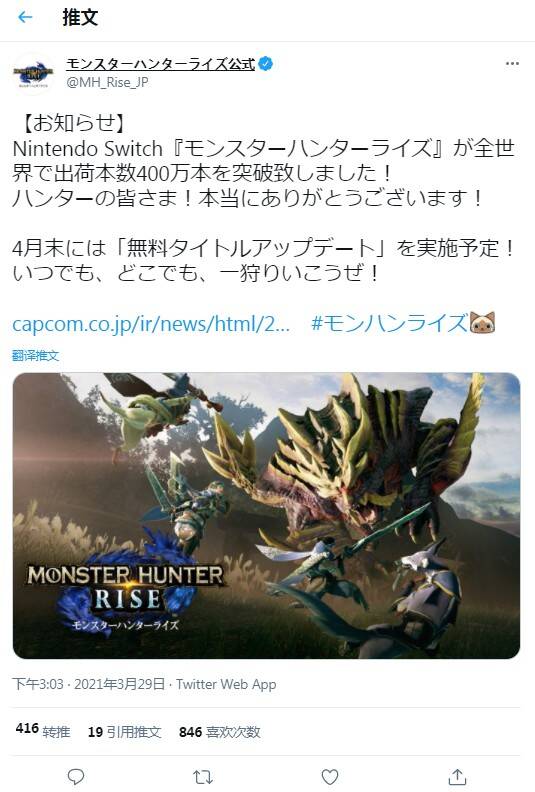 Capcom官方宣布:《怪物猎人:崛起》全球出货量突破400万份。