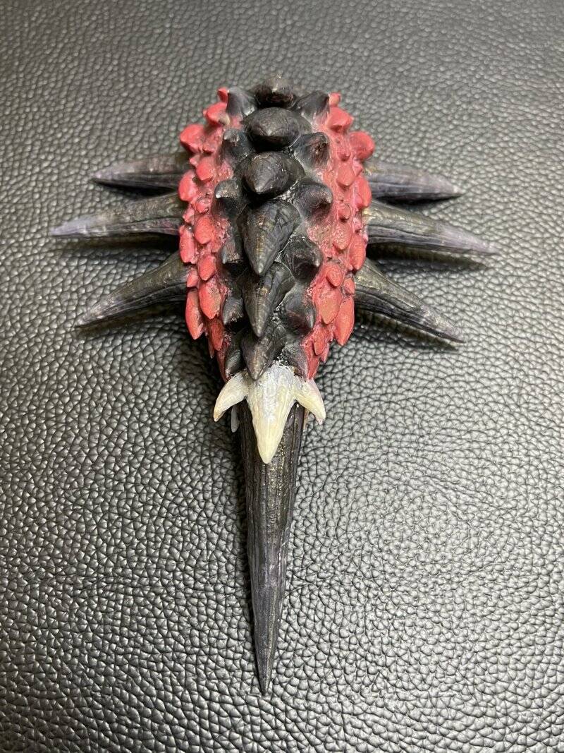 GRIZZRYPANDA 这里使用 vallejo 水性漆进行上色,表现出鳞片的色彩纹理、硬棘新旧角质的色彩变化,最后喷上亮光漆让整体质感更栩栩如生。断尾的切面则画出了一条条肌肉纹理,同样藉由亮光漆表现溼润质感的反光,让肉的鲜度大幅提昇!将醋饭放上龙尾,一贯鲜美可口的「火龙夫妇寿司」就完成了!