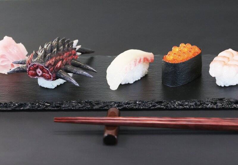 不过目前「火龙夫妇寿司」只是 GRIZZRYPANDA 自制的兴趣作品,希望未来有机会能够在 WONDER FESTIVAL 会场贩售或是由卡普空授权商品化呀!此外喜爱食物样品模型的 GRIZZRYPANDA 最近也开始亲手制作各种寿司,连旁边那坨红姜也是模型。看来 GRIZZRYPANDA 不只擅长制作美少女模型,食物模型的技术也让人十分期待!