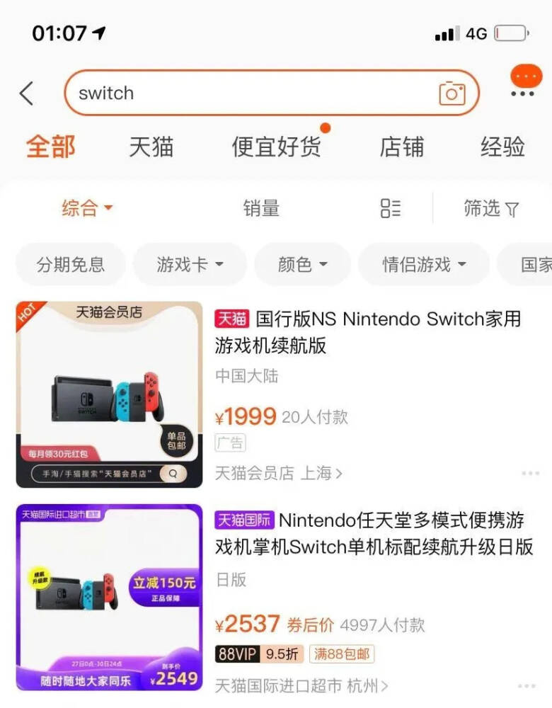 经查询,部分电商平台里的游戏店铺都无法搜到Switch等游戏主机的类目,即便有的游戏和主机版本类型多数都是国行,近期发售的3A大作《怪物猎人:崛起》已消失不见,并且搜索“Switch”或者“Switch卡带”等关键词,出来的结果都只有清一色的国行相关结果。